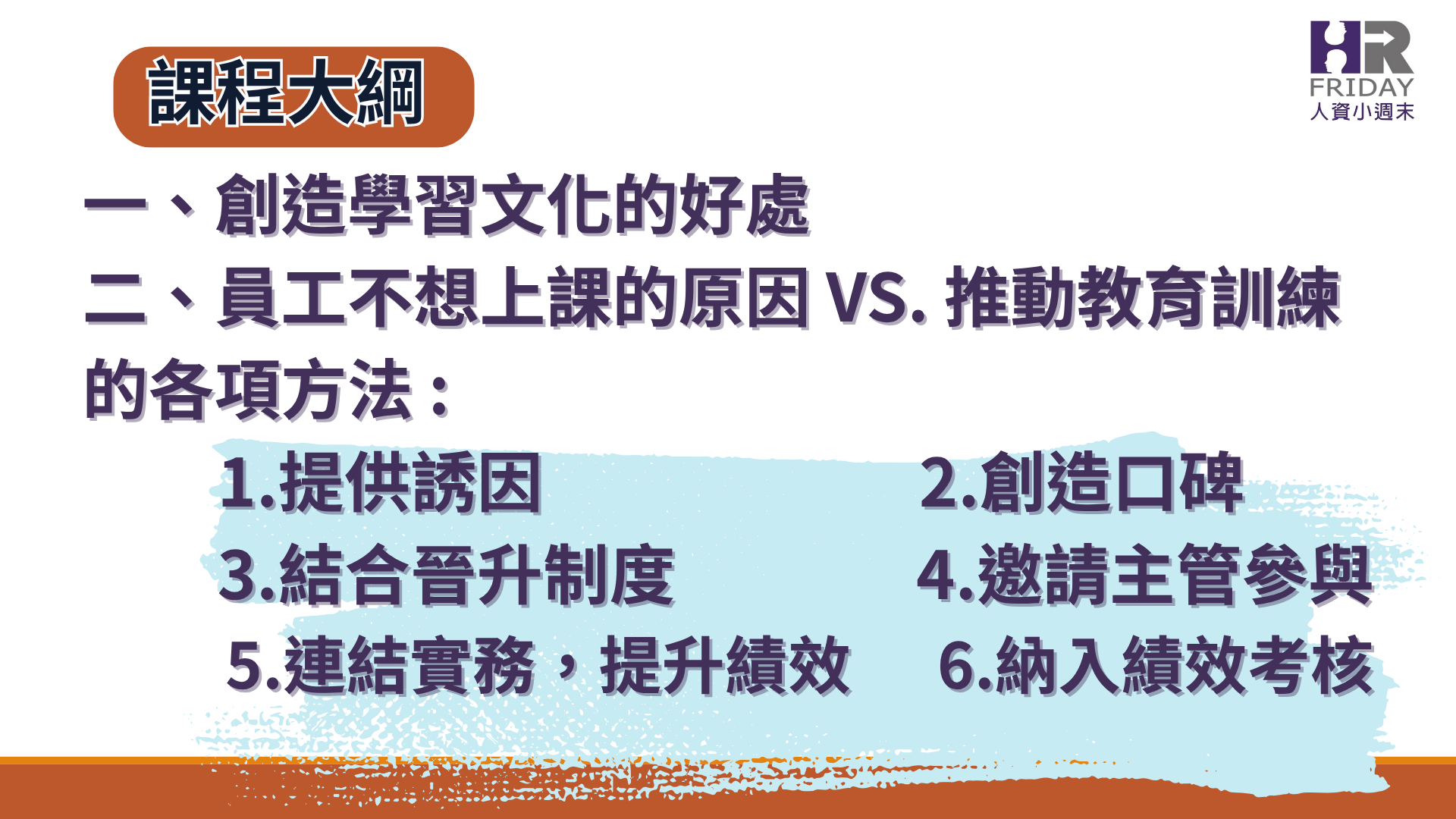 - 學會如何轉換「員工不想上課」的抗拒心理,為學習創造誘因。