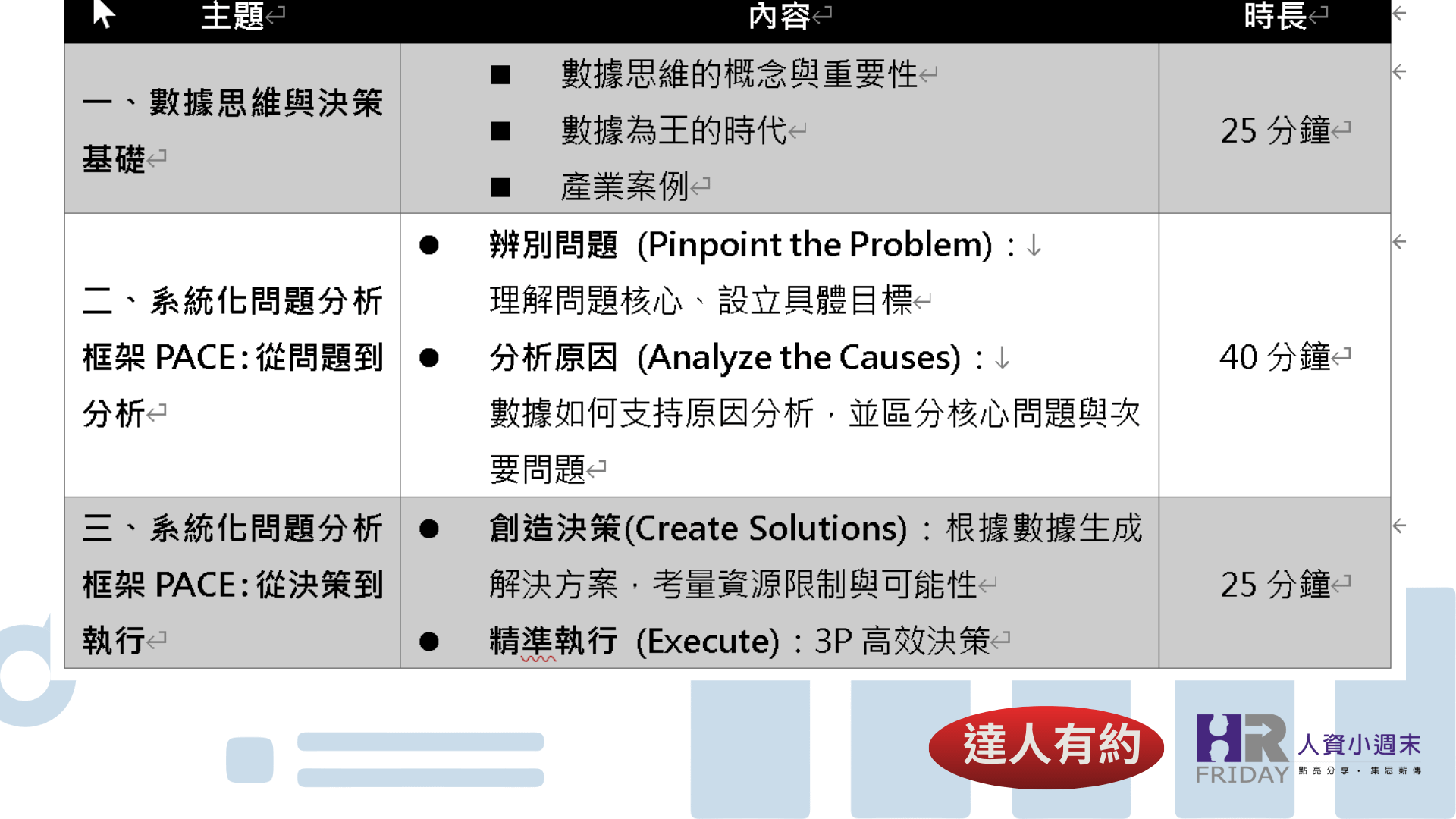 課程內容並非著重於資料分析工具或技術操作,而是聚焦於「如何思考與如何判斷」。學員將透過結構化的分析架構,理解數據在決策流程中的角色與限制,學習如何釐清問題本質、辨識關鍵影響因素,並避免常見的決策偏誤與錯誤假設。