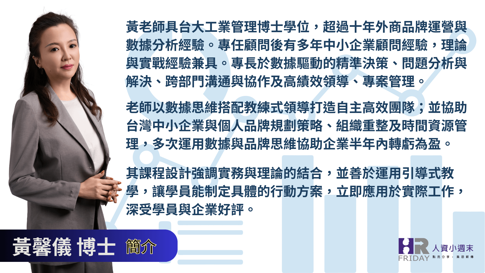 本課程以「數據思維」作為決策能力的核心基礎,旨在協助學員建立一套清晰、可驗證且可複製的決策流程,強化在複雜情境中進行分析、判斷與行動的能力。課程將引導學員跳脫僅憑經驗或直覺做決策的慣性,學習如何運用數據作為支持判斷的依據,提升決策的精準度與一致性。