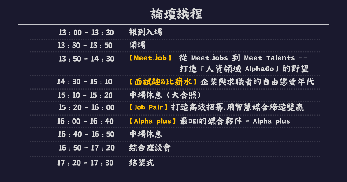 此次人資小週末十四年週年慶論壇,特地邀請四位非典型人力銀行專業人士,一同來探討現今人力銀行的轉變、就業市場的共同痛點、企業與求職者的平衡,以及探討新科技諸如AI對於人力的影響、以及現今的人脈經濟與人類之間的連結是否無可取代等等相關議題….