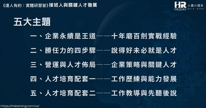 【《達人有約:線上研習營》接班人與關鍵人才發展】課程,端出五大主題如下: