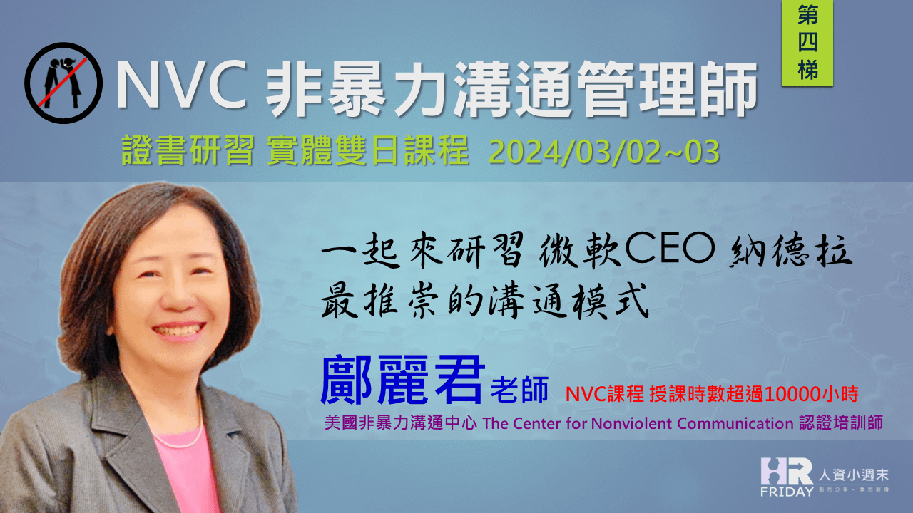 非暴力溝通是近年來關於溝通議題上,最熱門的一個研習課程。也是微軟CEO 納德拉最推崇的溝通模式,為將非暴力溝通更有效的引介給人資夥伴們,小週末在2023年開始,將與已取得『美國非暴力溝通中心 CNVC』認證培訓師的 鄺麗君老師展開深度合作。讓對非暴力溝通的內涵有興趣,或是想取得『非暴力溝通』相關認證資格的人資夥伴,提供系列的研習課程與交流聚會。而首先推出的就是『非暴力溝通管理師』證書研習雙日課程。