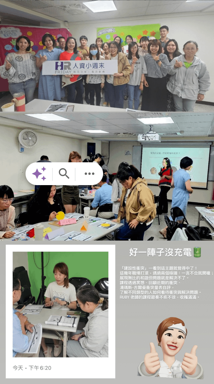 <學員回饋> : 建設性衝突」一看到這主題就覺得中了!謝謝世安哥推薦課程。這些年職場打滾,遇過兩個極端:一言不合就開嗆;展現無比的和諧但問題就是解決不了。我實在對於建設性衝突管理充滿好奇。課程透過冥想、回顧近期的衝突、湯瑪斯-吉爾曼衝突量表自評,了解不同類型的人如何看待衝突與解決問題。RUBY 老師的課程節奏不疾不徐,收穫滿滿。超級推薦!