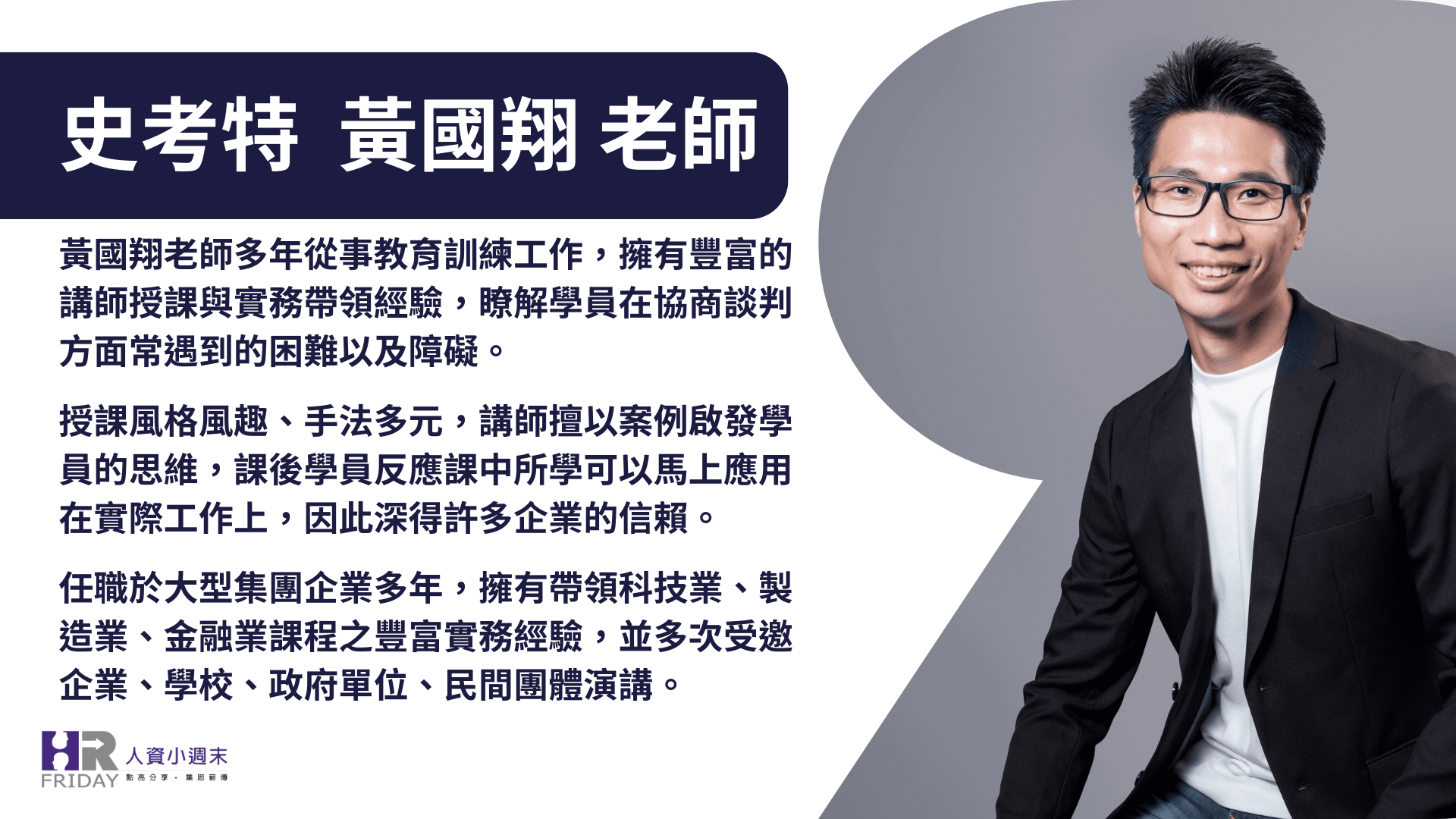 加入我們的線上研習班,學習如何輕鬆解決員工議題,提升您的管理與談判技巧!立即報名,讓黃國翔老師為您的職場管理帶來新思維與新方法!