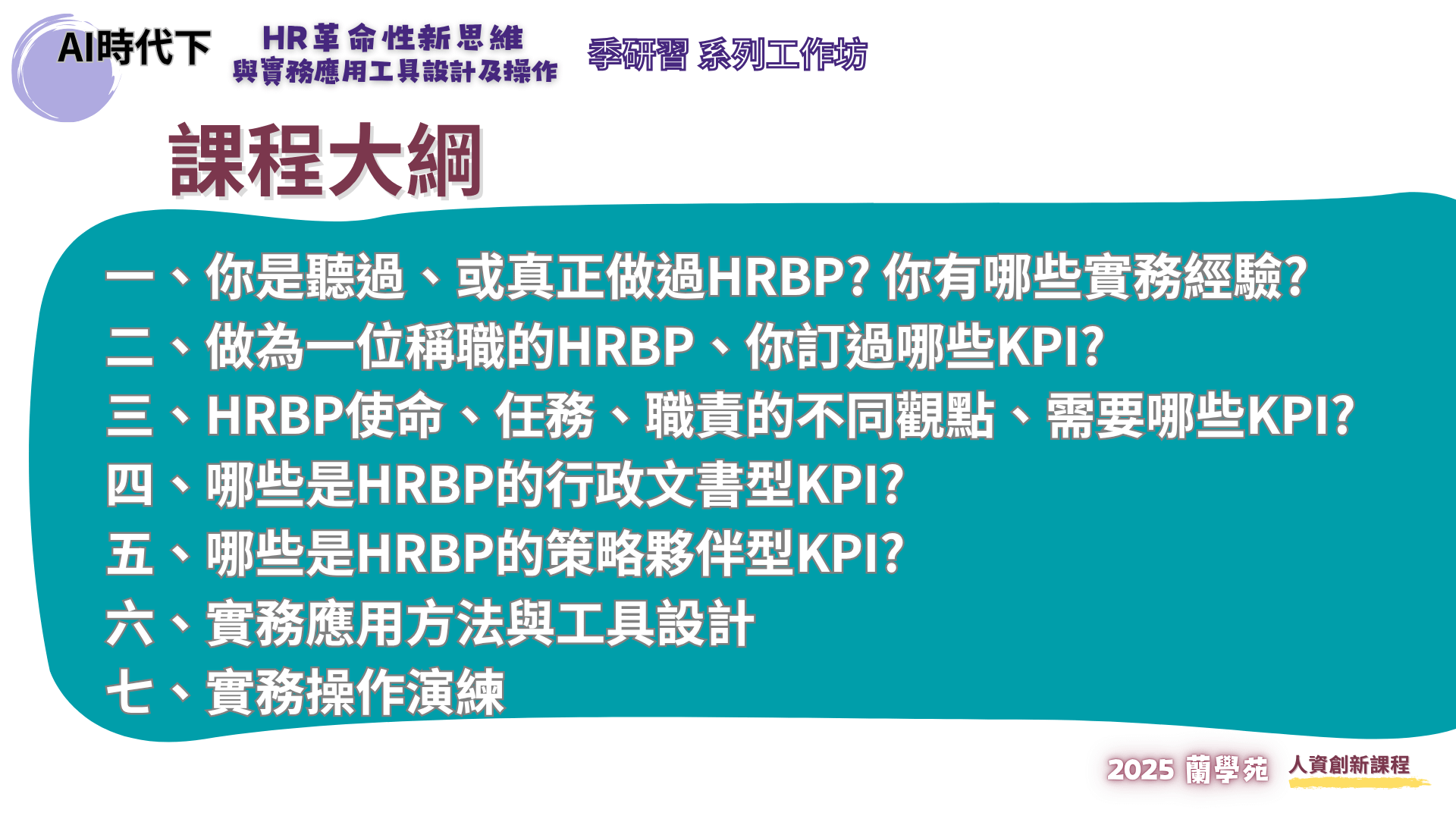 蘭學苑 2025 一日研習工作坊 : 主題【以KPI為起點的分析與實務應用】~ 你是行政文書型,還是策略夥伴型的 HRBP?