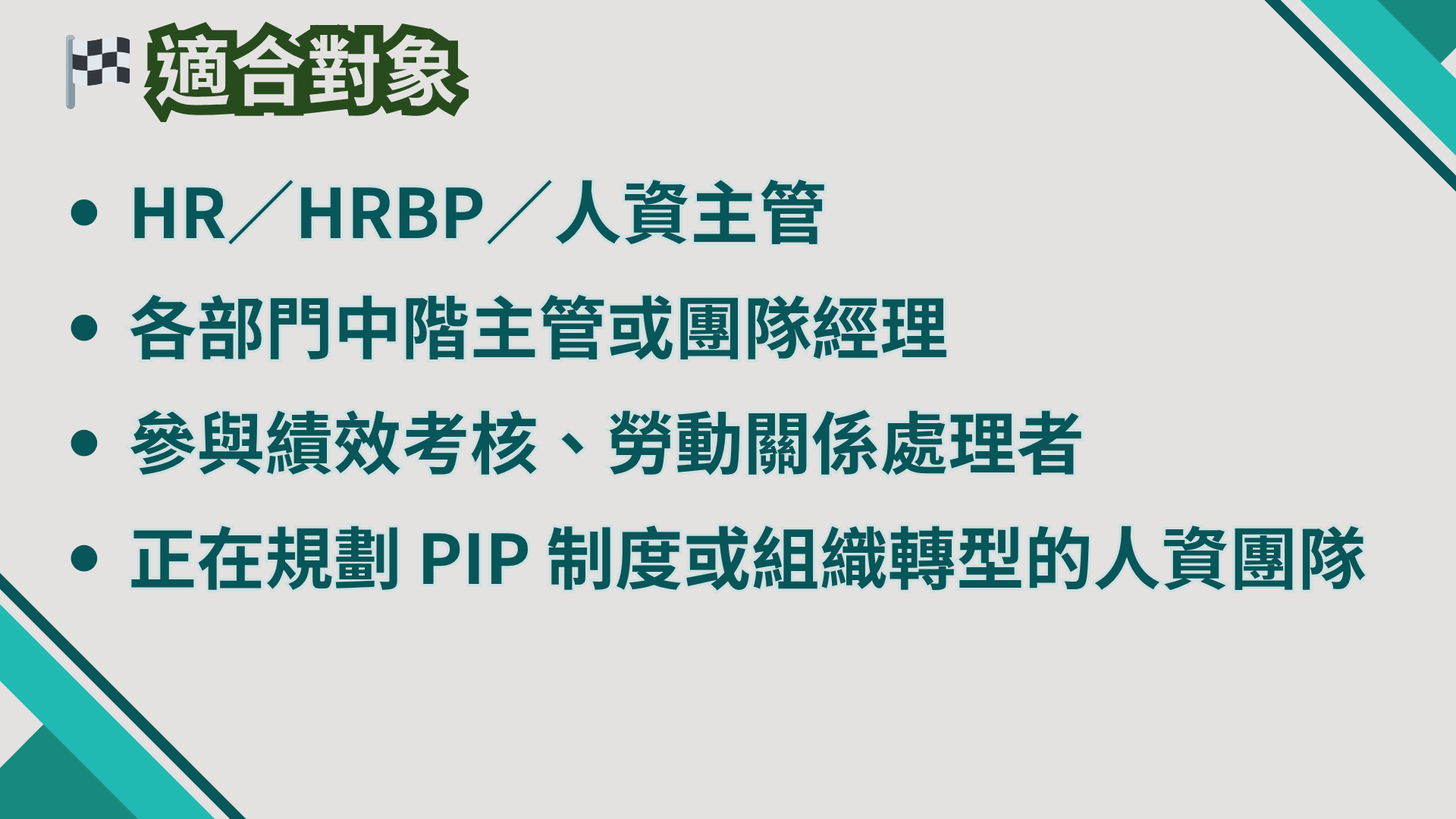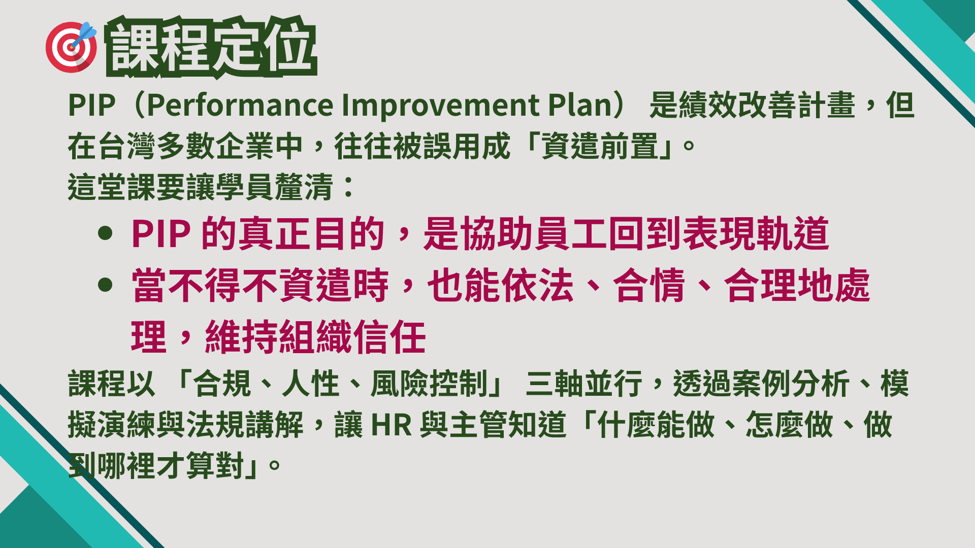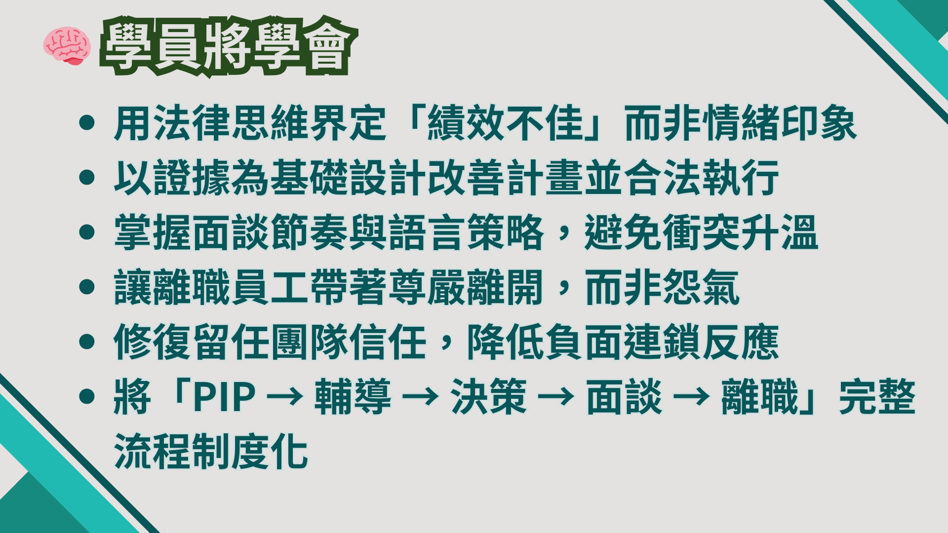 🔹 目標:釐清「績效 vs. 紀律」、「合法 vs. 不當解僱」的界線,建立決策者的風險意識,讓企業在合情合理的前提下依法行事。