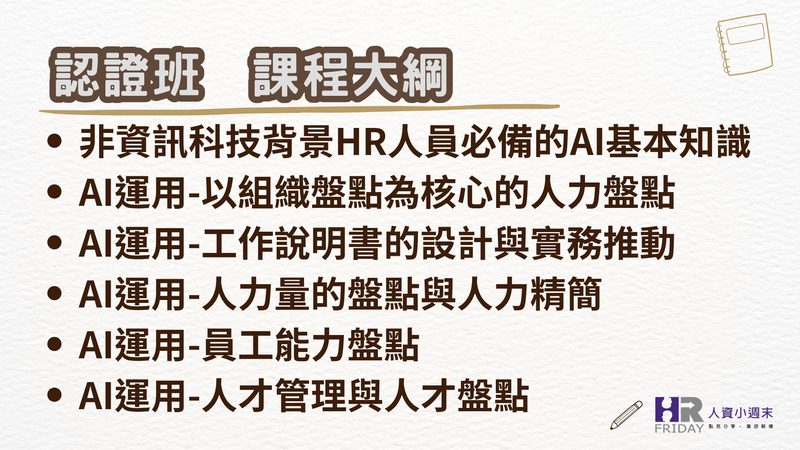 《AI時代下的人力盤點 專業認證班》正是為了讓HR能夠理解AI、運用AI、整合AI,