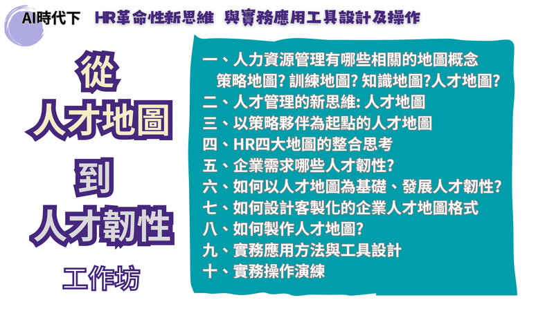 課程將詳細解析人才地圖的概念,並結合實務操作,讓學員從零開始掌握設計流程,打造出符合企業需求的專屬人才地圖。