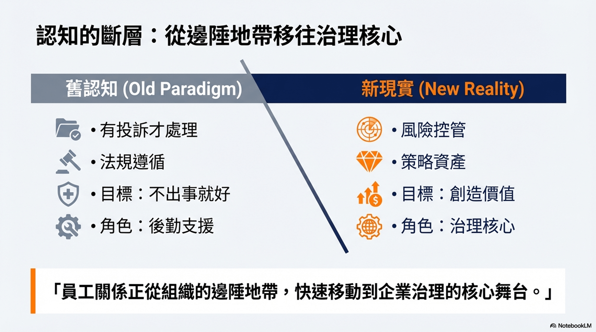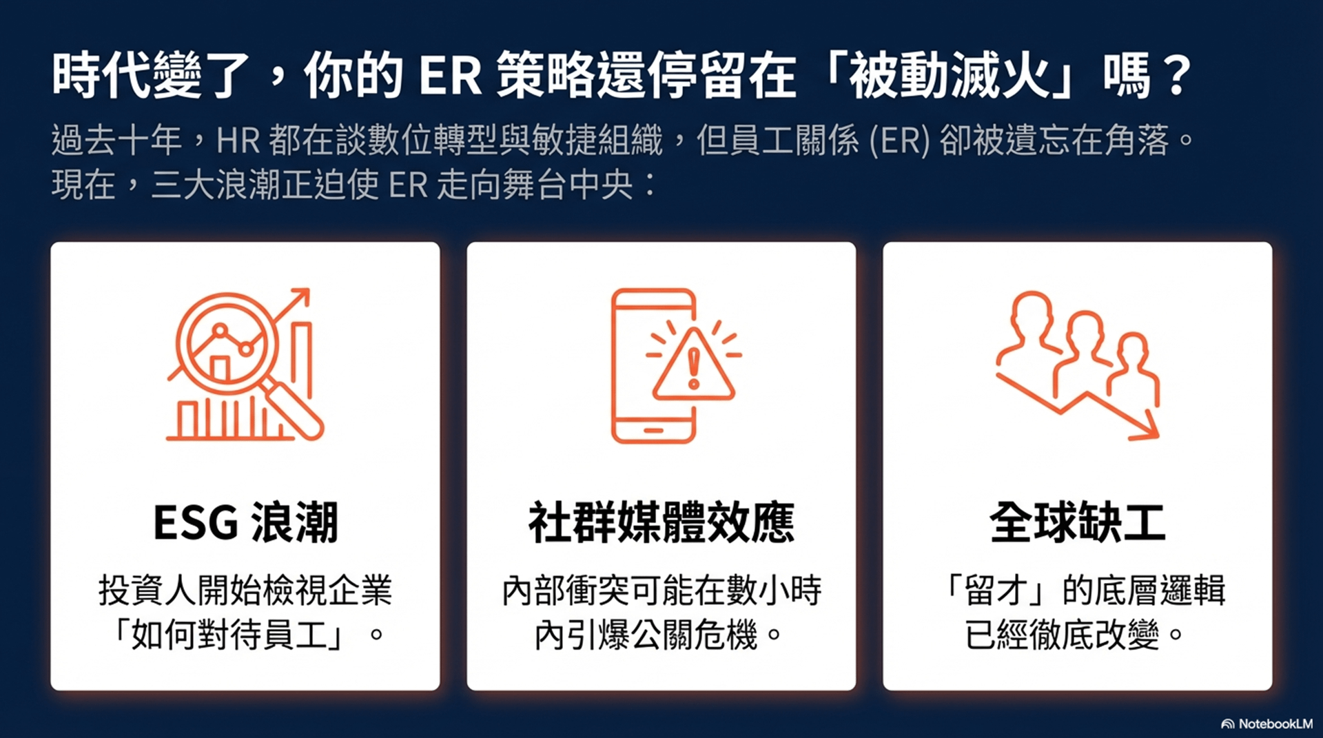 然而,環境已經徹底不同了。ESG浪潮讓投資人開始檢視企業如何對待員工,社群媒體讓任何一起內部衝突都可能在數小時內成為公關危機,而全球勞動力短缺更迫使企業重新思考「留住人」的底層邏輯。員工關係正從組織的邊陲地帶,快速移動到企業治理的核心舞台。