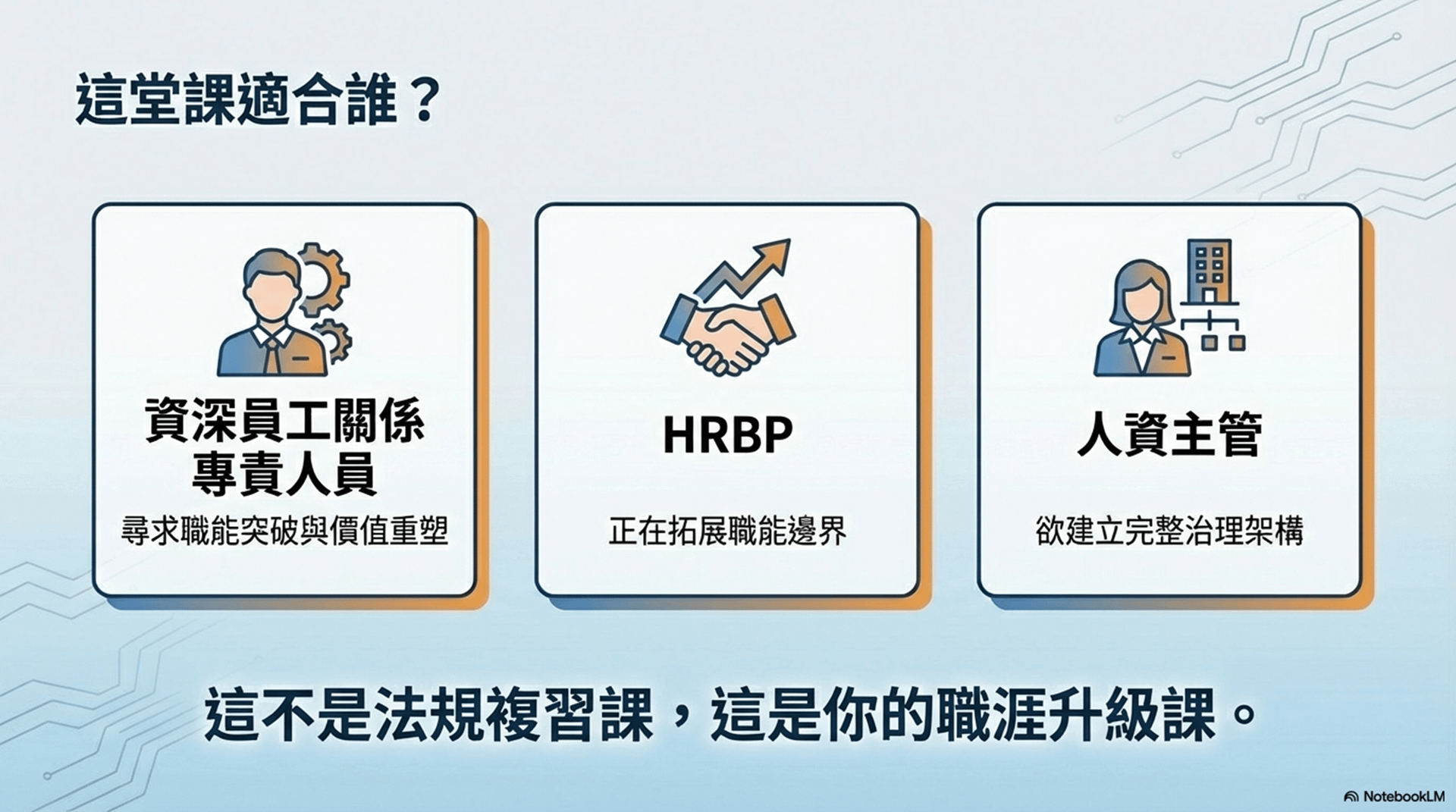 這堂課不是傳統的勞動法規複習,也不是申訴處理的SOP教學。我們要做的是一次認知升級——重新理解員工關係在當代企業中的戰略角色,並為HR夥伴提供一套能與董事會、經營層對話的語言和架構。無論你是資深的員工關係專責人員,還是正在拓展職能邊界的HRBP,這堂課都將為你打開一個全新的視野。