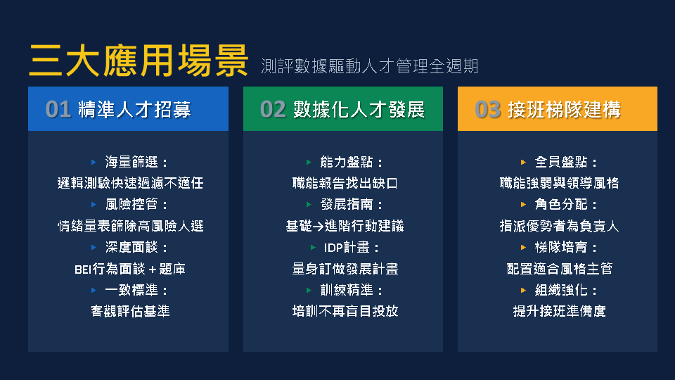 從多元測評數據,建構出結構化的人才畫像(Structured Talent Profiling),讓企業對於人才有更全貌的了解,不僅在招募選才上,除了人才的能力之外,也綜合評估其與組織的適配性;在訓練發展上,依照每人的能力與動機的不同,訂定更符合的個人發展計畫,而在整體組織接班規劃上,同時評估人才績效與領導潛力,找出最適合的人才。