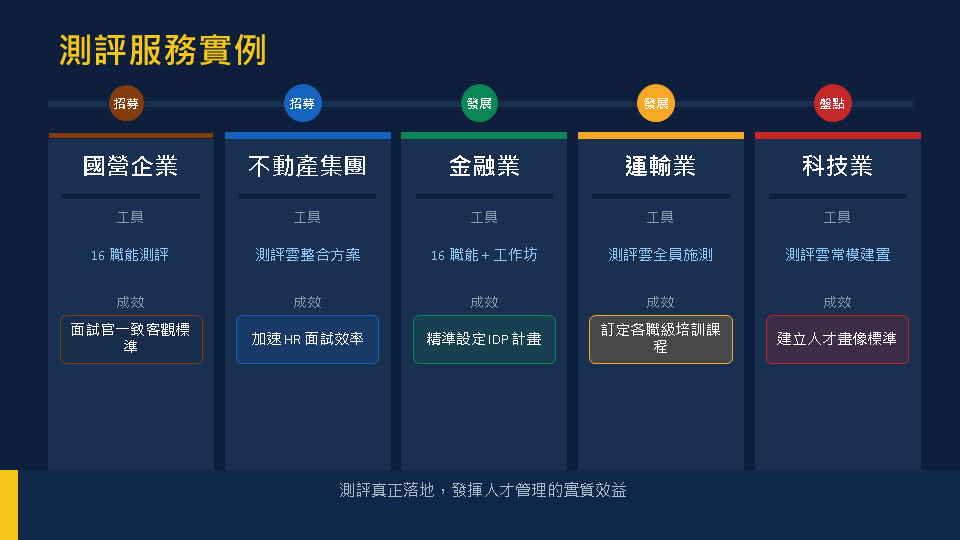 l招募:某不動產集團導入測評雲,在不同的職務招募時選擇適合的測評工具,協助HR及直線主管在面試時,從多面向評估面試者,加速HR的面試效率。