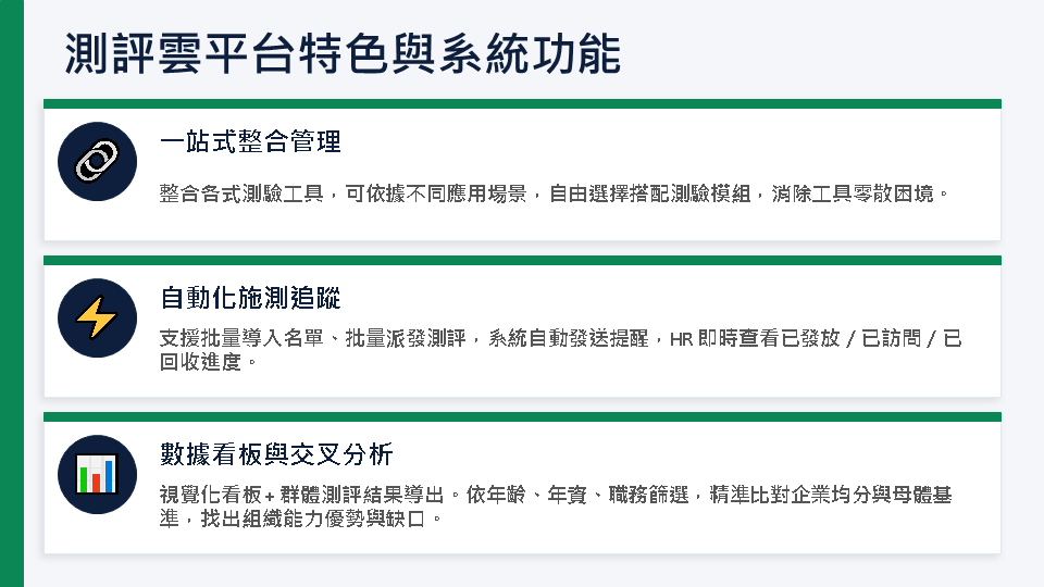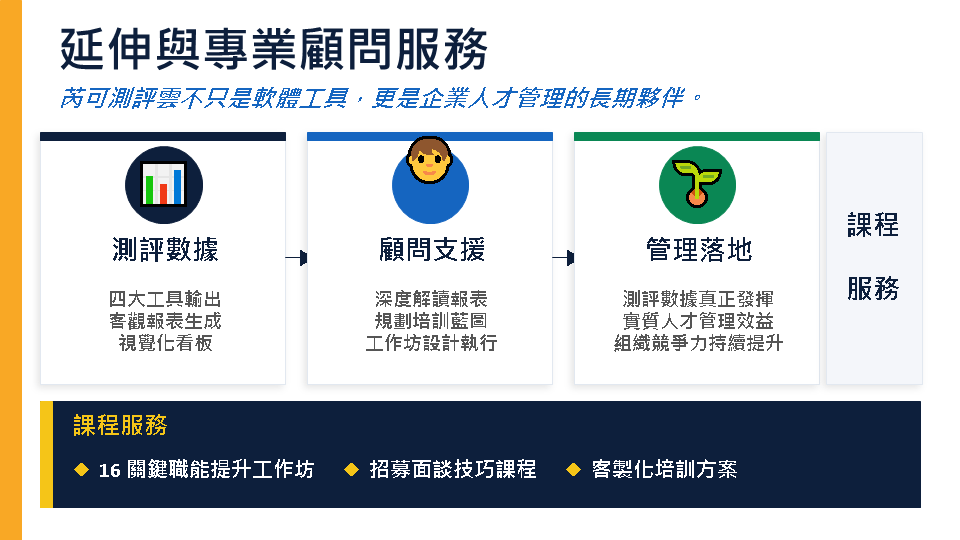 - 一站式整合管理:整合各式測驗工具,可依據不同應用場景,自由選擇搭配測驗模組。