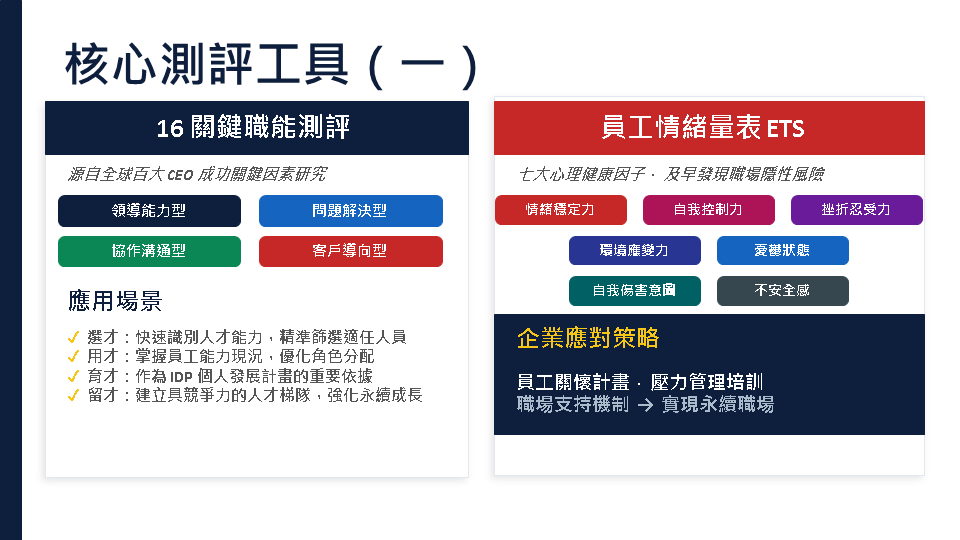 透過科學化的職能測評工具,企業能快速獲取客觀數據,精準識別人才能力,並在選才、用才、育才與留才各個環節提升決策品質。16關鍵職能測評不僅能幫助企業優化人才選拔流程,還能作為人才發展計畫與職涯規劃的重要依據,推動組織建立具備競爭力的人才梯隊,強化企業的永續成長動能。