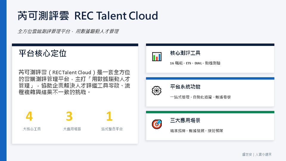 芮可測評雲(REC Talent Cloud)是一套全方位的雲端測評管理平台,主打「用數據驅動人才管理」,協助企業解決人才評鑑工具零散、流程複雜與結果不一致的挑戰