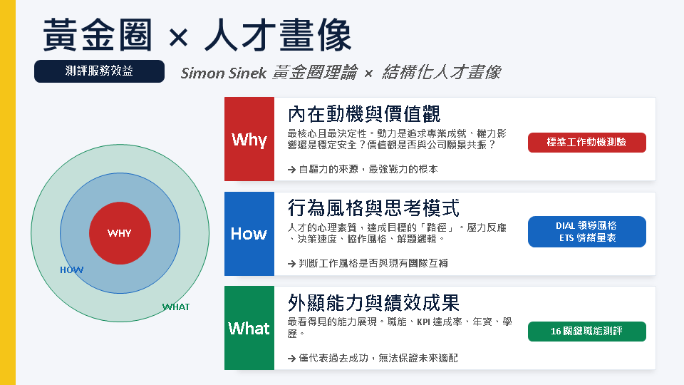 除將測評運用在招募、人才發展、組織盤點的應用場景上,亦可透過多面向的測驗數據,看透人才的行為邏輯與驅動來源,解釋為什麼有些人能持續卓越,而有些人卻後繼無力。而要破譯人才的成功密碼,我們可以藉由賽門·西奈克(Simon Sinek)的黃金圈(Golden Circle)概念,由內而外重新剖析人才的結構,將數據轉化為深度的行為洞察。