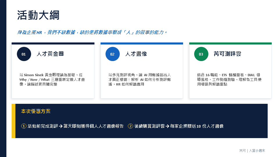本次研習營將帶領您跳脫單一測驗的框架,結合芮可測評雲的數據洞察(16關鍵職能測評、員工情緒量表、領導風格測驗、標準工作動機測驗),理解各種測評的使用場景與解讀重點,並運用「黃金圈」思維建構一個可被溝通、被應用、被發展的 Talent Profile 人才畫像。