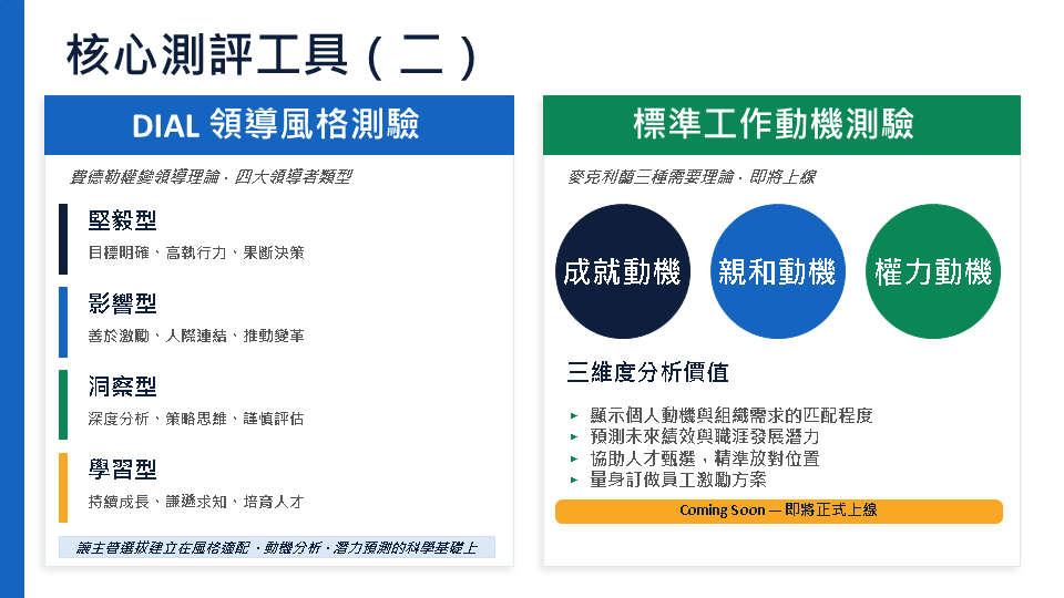 - 數據洞察: 驅動他每天努力工作的動力是什麼?是追求專業成就、權力影響、還是穩定安全?他的價值觀是否與公司願景共振?
