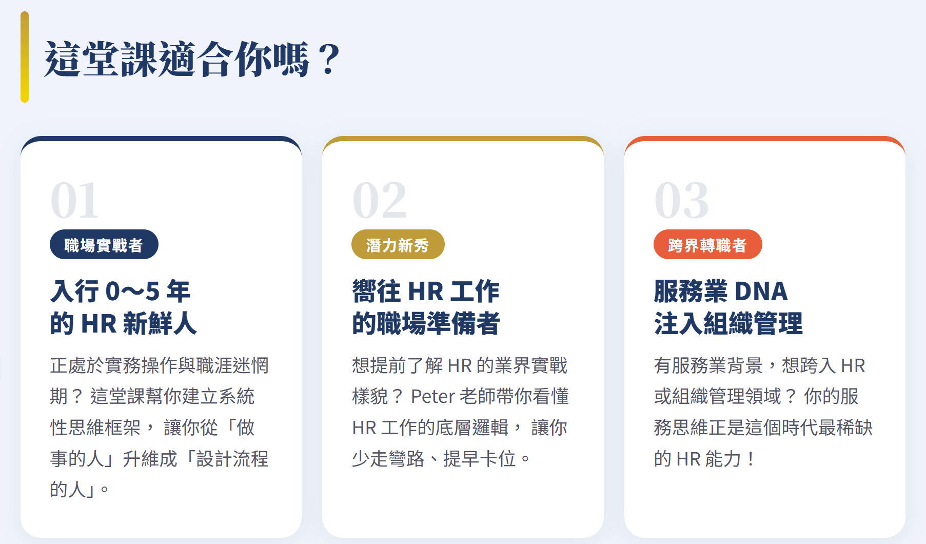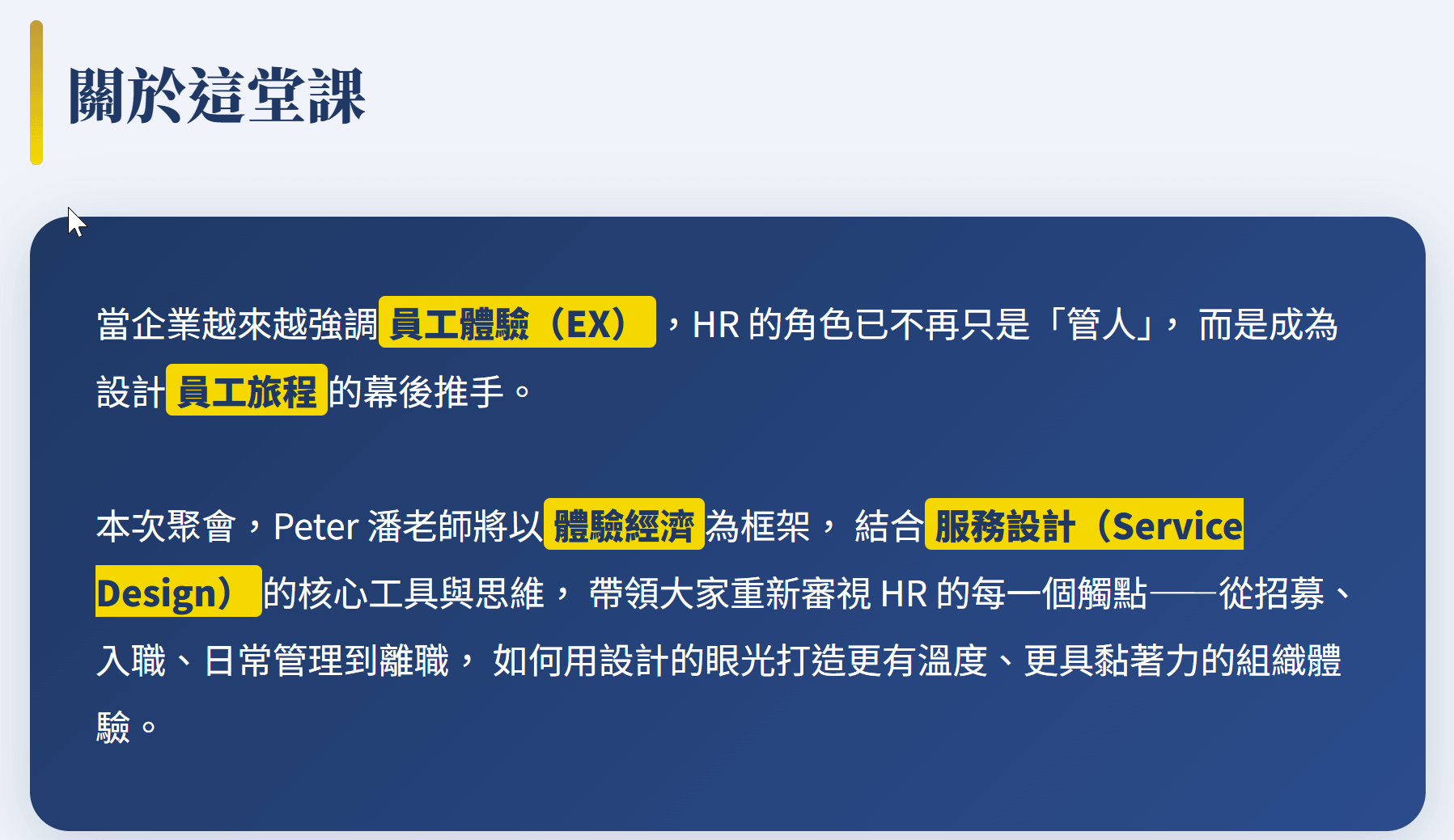 - 探討如何將體驗設計思維落地到招募、入職、培育、離職等關鍵 HR 流程
