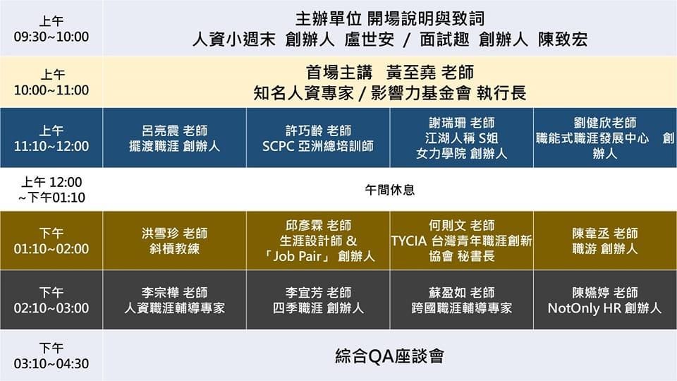 今年首發年會我們一共邀請了13位 專家舉辦13場主題講座,以及一場綜合座談會!透過多元角度了解職涯輔導過程中的不同觀點,了解新的型態、工具與概念如何運用與執行~讓你透視職涯顧問的專業工作內容,進一步發現職能以及職涯輔導的未來方向!而在最後 長達90分鐘的的綜合座談會,將會提供充足的QA時間,讓與會的大家可以和講師進一步互動與提問喔🤩🤩