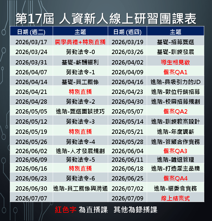想要打造人資基本功、成為具有人資硬實力和軟實力的職場高手,卻不知道從何下手嗎?無論您是否有相關科系背景,線上新人團都會帶您從零開始了解人資知識!