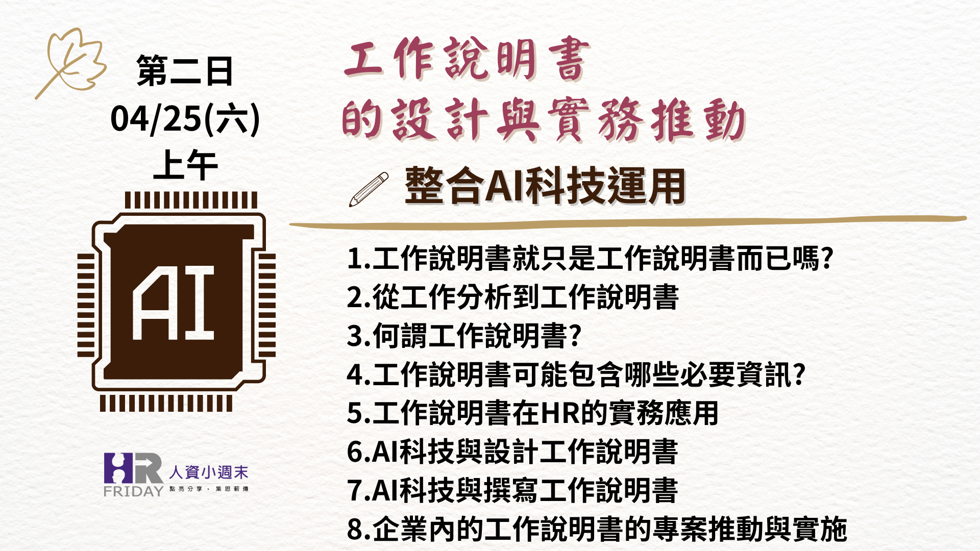 這堂課從根本解決這個問題。學習脈絡從「工作分析」到「工作說明書」的邏輯轉換出發,幫助學員掌握職責層次的清晰設計與關鍵任務的結構化表達,讓每一份J.D.都能真正反映工作的核心本質。更關鍵的是,課程透過AI工具的導入,讓學員學會快速生成、優化與比對不同職務說明,大幅縮短J.D.建置時間,同時提升跨部門的一致性與可比較性。