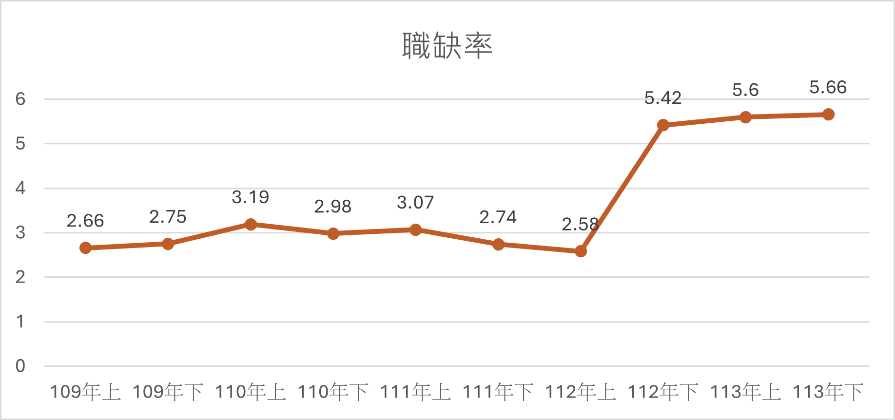 缺工並不是一個嶄新的議題,但為何缺工會被如此看重呢 ? 其實缺工已經從一個議題變成常態現象了。由於職缺率常被視為缺工指標,所以我們可以先從職缺率簡單判讀目前缺工問題,根據下圖勞動部職缺率數據顯示,在112年之前職缺率平均3%然而到112年後突增至5.42%,顯示台灣出現嚴重勞力缺口,企業面臨更招不到人的困境。根據104人力銀行所發布的民生消費產業人才白皮書,缺工產業中以餐飲業最為嚴峻其次為零售業、批發業,面對越發嚴峻的缺工問題,你做好準備了嗎?