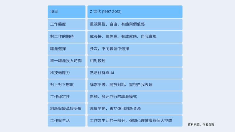Z世代因從小與智慧型手機、社群媒體、雲端科技為伍,因此被稱為「數位原住民」,科技已深植於他們的生活。相較於過去世代,Z 世代在職場上的忠誠度與穩定性相對較低,工作態度可能較為消極。由於處在「數位創作者」、「斜槓人生」與「遠距工作」蓬勃發展的時代,對於工作與收入的想像也更加多元,不認為人生只有一條職涯道路,因此他們渴望彈性的工作型態、偏好可以展現自我與創造影響力的環境,不願將所有時間與精力投注在單一職位上,而更重視工作是否能帶來成長空間、自我價值與生活品質的平衡。